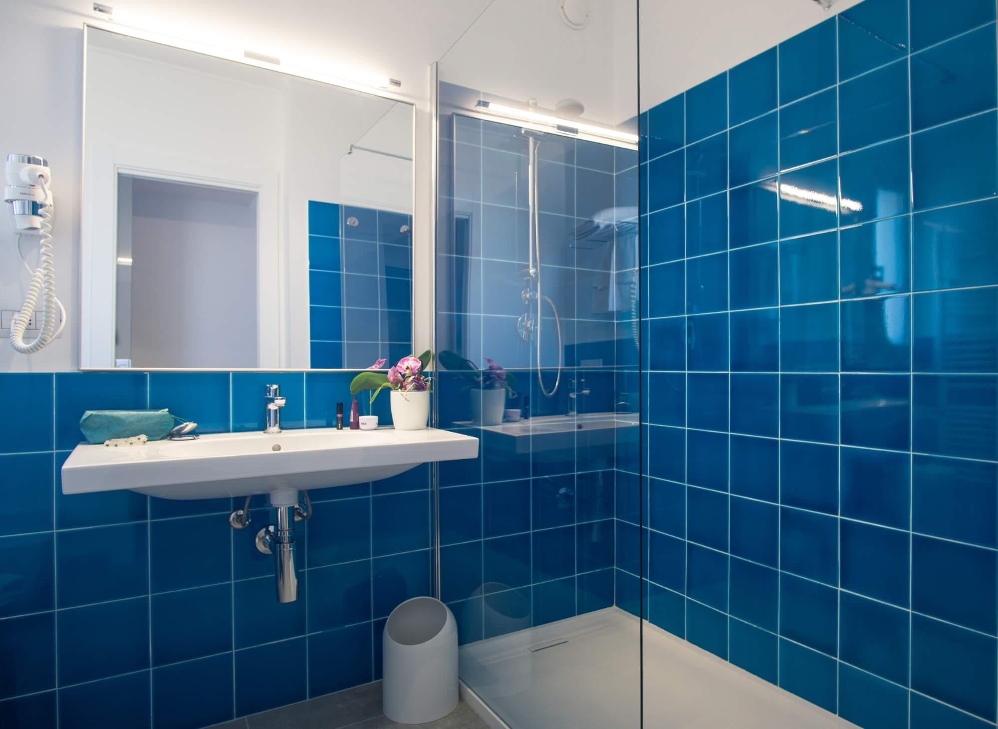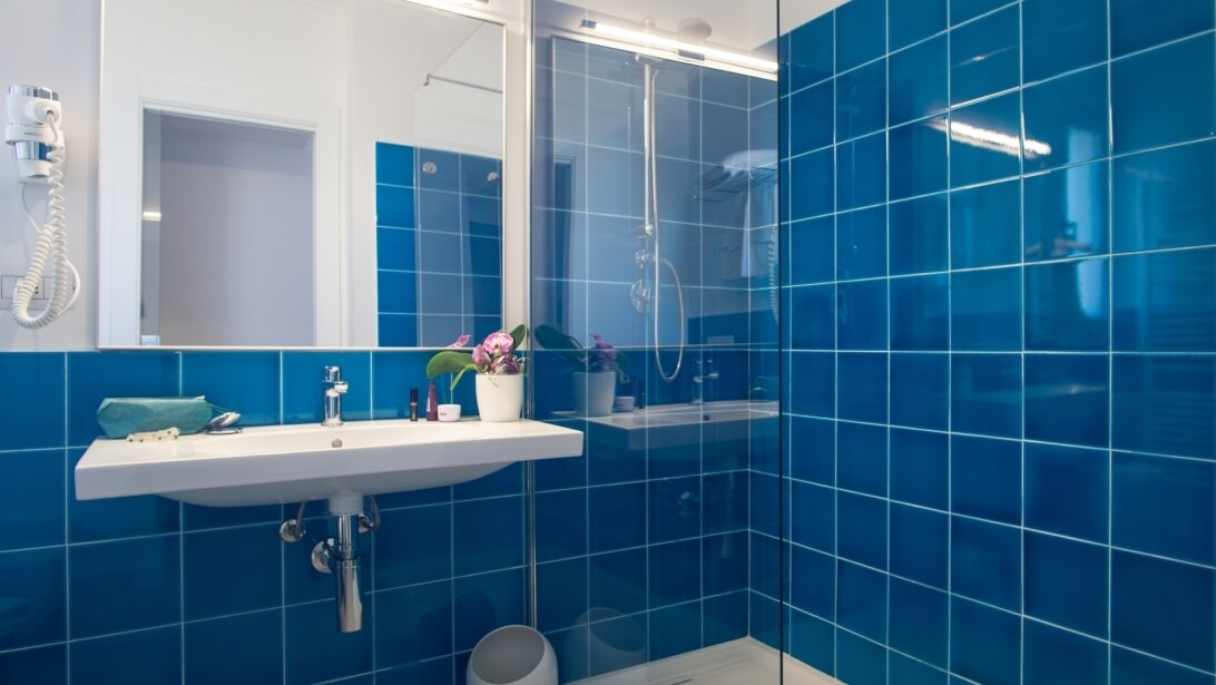 Il bagno, completamente rinnovato, accoglie con un’ampia doccia walk-in e rivestimenti che richiamano i colori luminosi del nostro meraviglioso mare, creando un’atmosfera fresca e rilassante.