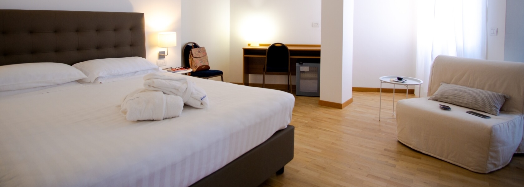Renovated in their essential parts, superior rooms are considerably more spacious than classic rooms, equipped with an upholstered bed and two chair beds or a sofa bed. The bathroom has been completely renovated with a large recessed shower and finishes inspired by the colours of the sea.